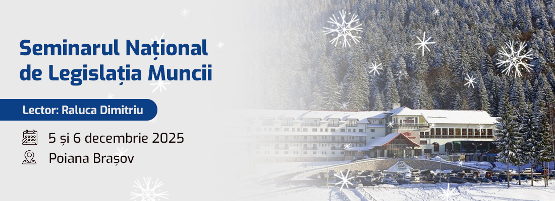 Va invitam la un seminar super-profesionist despre ultimele modificari aduse legislatiei muncii, organizat in Poiana Brasov, cu posibilitatea de cazare in perioada 4 - 7 decembrie 2025. Imbinati placerea cu utilul si scapati de problemele generate de ambiguitatea legii!
